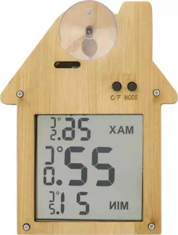 Een weerstation vormt een handig relatiegeschenk dat jouw merk in gedachten brengt telkens wanneer mensen naar de temperatuur kijken. Dit bamboe weerstation heeft de vorm van een huis en is uitgerust met een zuignap aan de achterkant, waarmee je het eenvoudig op een raam of andere gladde ondergrond kunt bevestigen. Het weerstation toont niet alleen de actuele temperatuur, maar ook de minimale en maximale temperatuur. Gepersonaliseerd met jouw logo is dit cadeau helemaal af. Batterijen zijn inbegrepen.