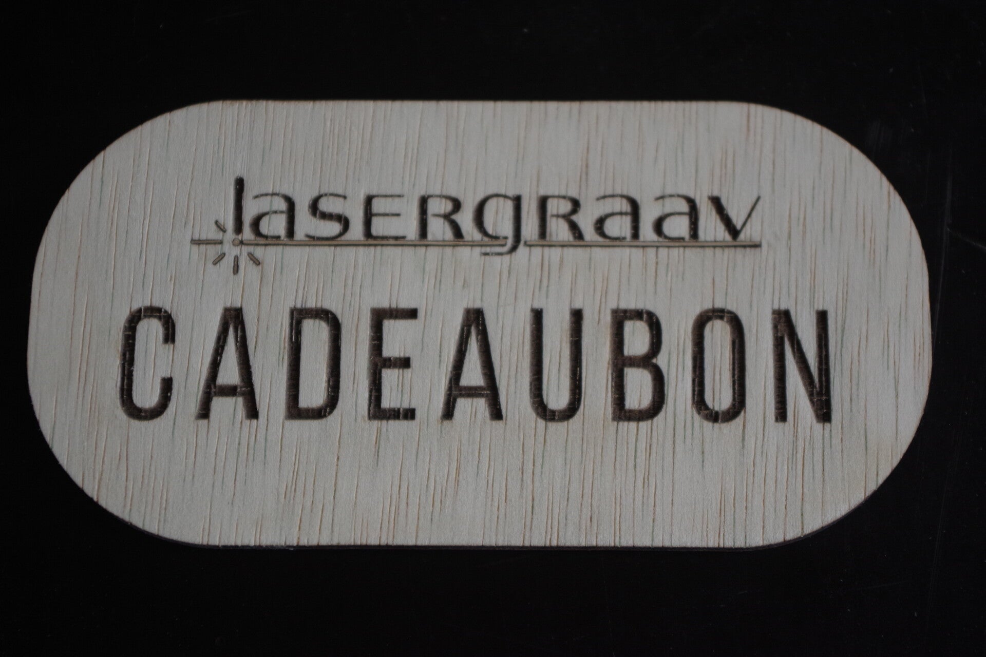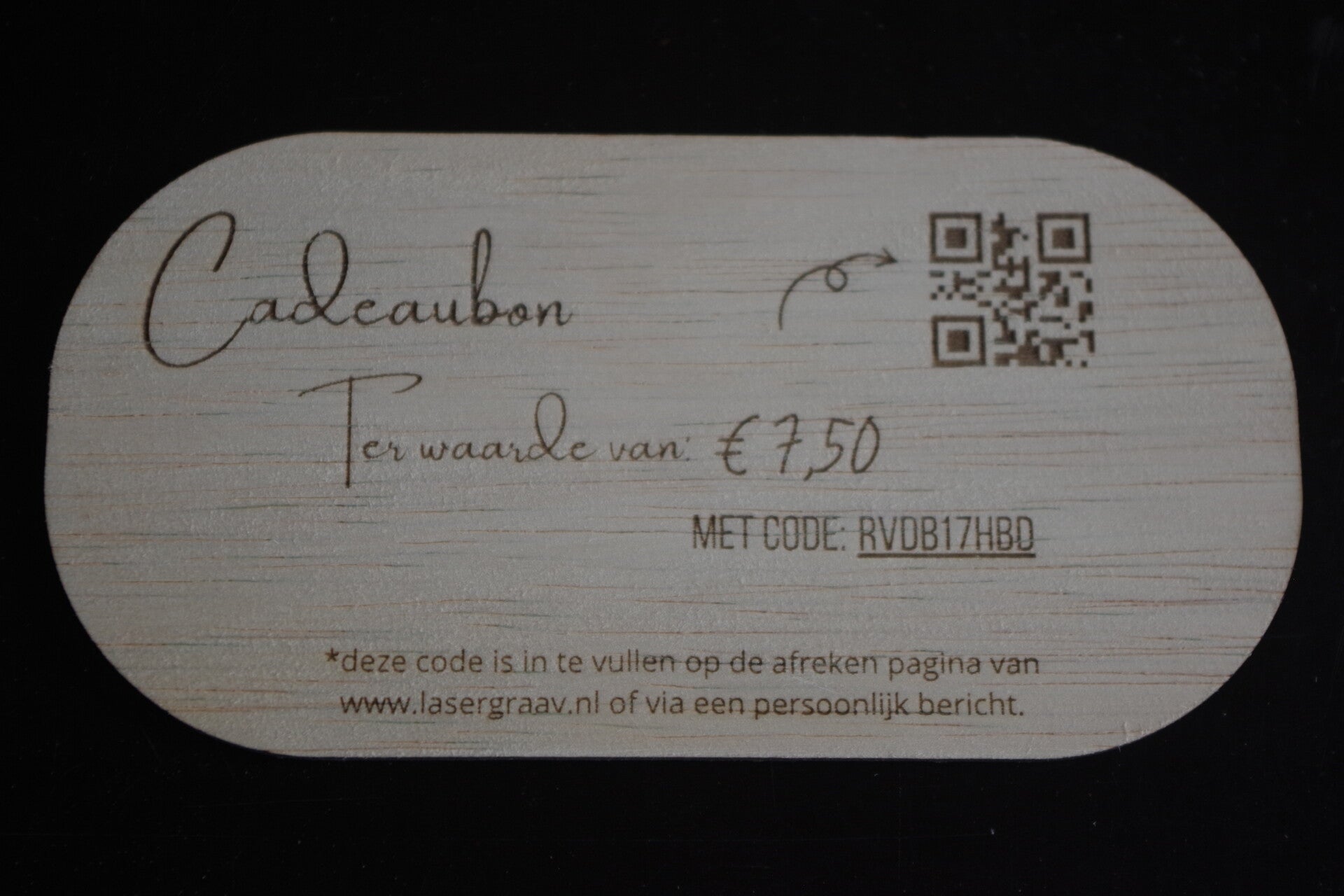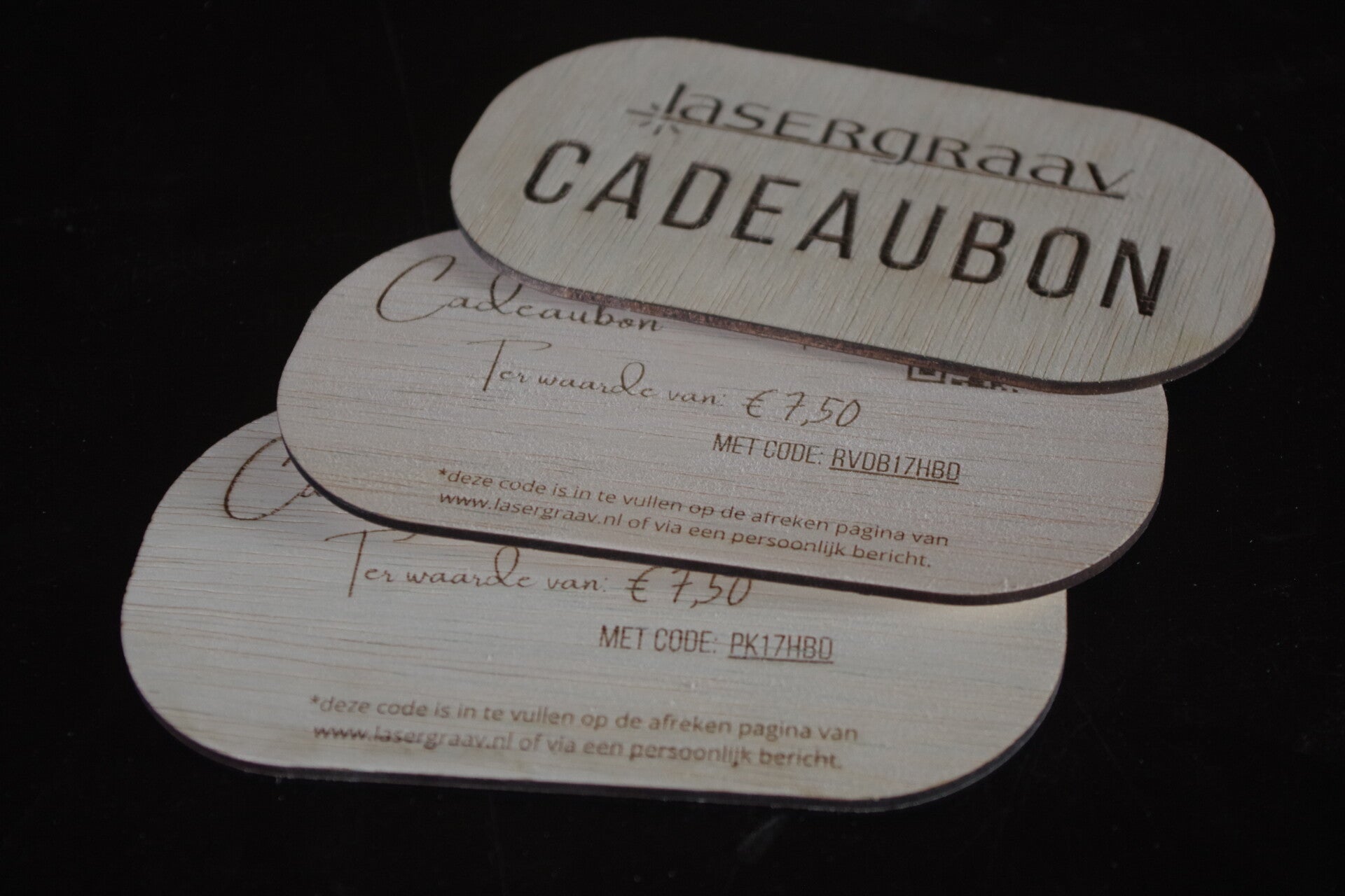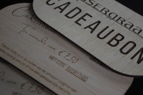 Lasergraav cadeaubon, uniek om te geven. Op de achterkant wordt het gewenste bedrag en code gegraveerd, waarmee je met dat bedrag kunt kopen.